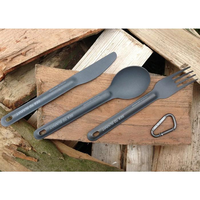El juego Alpha Light Spork, Fork and Knife es una adición ultraligera y duradera para cualquier cocina de campamento. Su tamaño y forma tradicionales le brindan un poco de hogar donde lo necesite, mientras que el aluminio de calidad aeronáutica está anodizado duro. Esto lo hace súper duradero y liviano, además de que no hay riesgo de que la aleación se filtre en los alimentos.