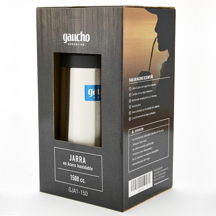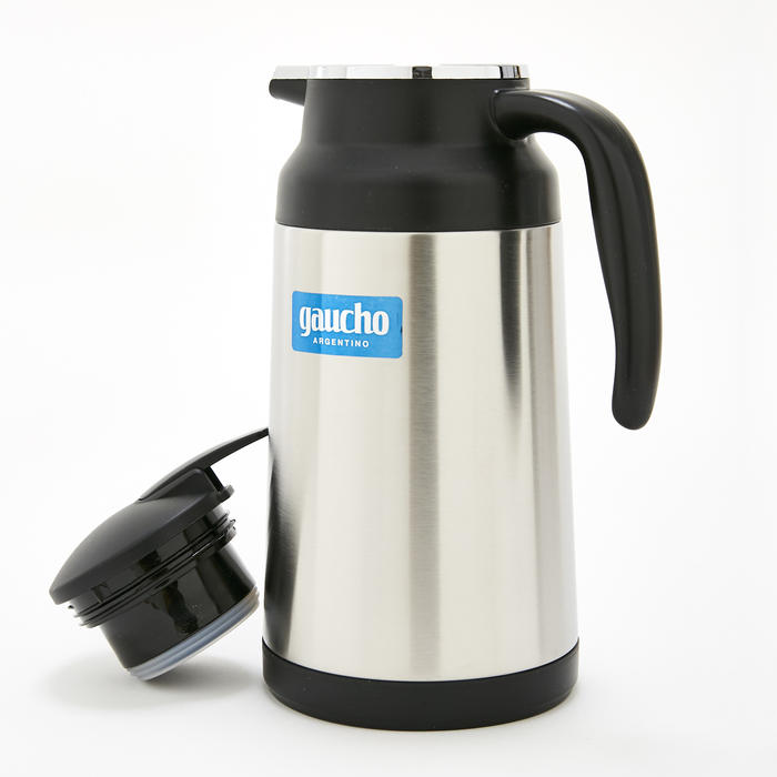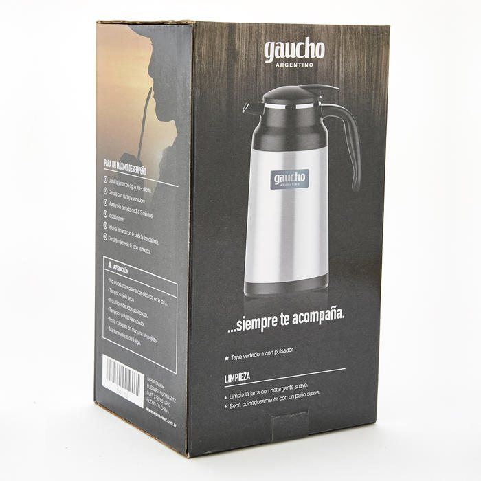 Jarra Cafetera de 1500cc. Gaucho Argentino de Acero Inoxidable AISI 304, apta para el contacto con alimentos. Autorizada por INAL con Garantía de 1 Año por sobre la cámara de vacío y su capacidad de aislación únicamente.