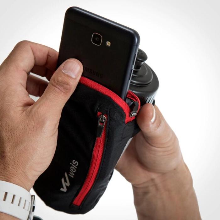 Dos bolsillos con cierres aumentan su capacidad de almacenamiento, ideales para llevar un smartphone, geles, llaves o dinero con la mano relajada gracias a su agarre ergonómico. El sistema de ajuste permite reemplazar la CARAMAÑOLA 500 ML que viene incluida por una botella descartable.