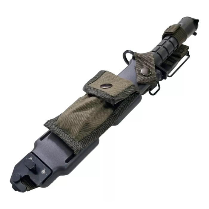 Incluye funda Rígida de color Gris con correas y bolsillo en tela de color verde. Ideal para actividades de supervivencia, camping, combate.