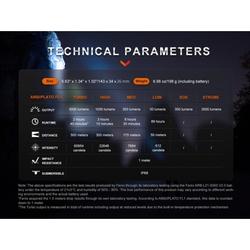 El tiempo de ejecución de la salida Turbo es de 2 horas y 40 minutos. La luz acumulará rápidamente una gran cantidad de calor cuando se utilice en 3000 lúmenes/salida Turbo. Cuando la luz alcanza una temperatura de cierto nivel, automáticamente bajará unos cuantos lúmenes para reducir la temperatura. Por lo tanto, el tiempo de ejecución de la salida Turbo se mide en un total de tiempo de ejecución, incluida la salida a niveles reducidos debido a la temperatura o al mecanismo de protección del diseño. Los datos indicados son de los resultados producidos por Fenix a través de sus pruebas de laboratorio bajo la temperatura de 21±3°C según el estándar ANSI/PLATO FL1. (Para conocer el rendimiento específico del tiempo de ejecución, consulte el gráfico de tiempo de ejecución en el manual)