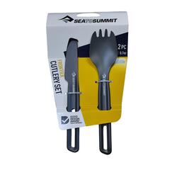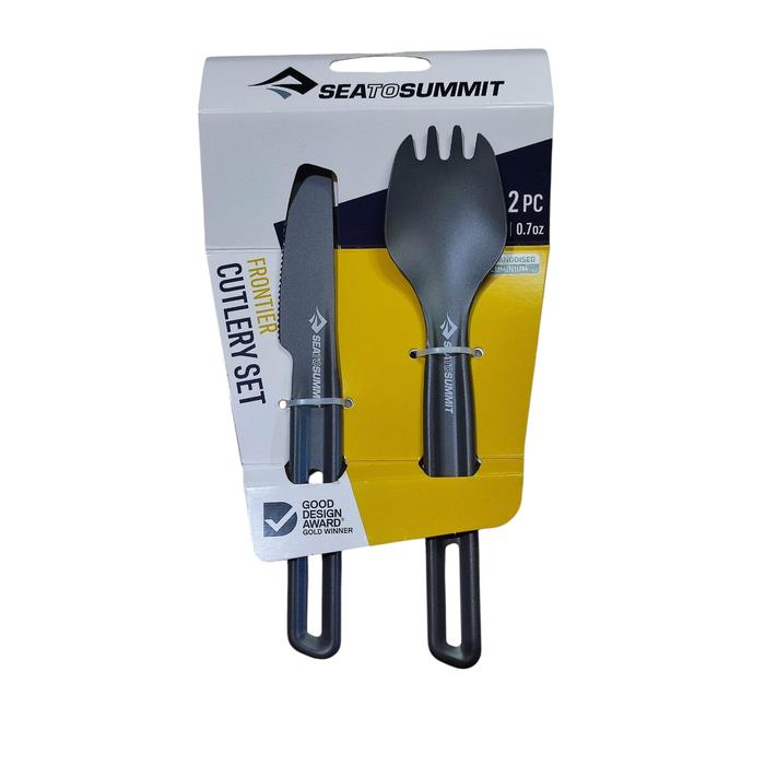 El juego de cubiertos Frontier de 2 piezas combina un cuchillo y un tenedor-cuchara para los chefs de montaña que buscan hacer más con menos. El aluminio anodizado duro de grado aeronáutico hace que estos utensilios sean tan resistentes como ligeros; el diseño Sea to Summit los hace ergonómicamente funcionales. Un minimosquetón mantiene el juego unido al guardarlos después de usarlos.