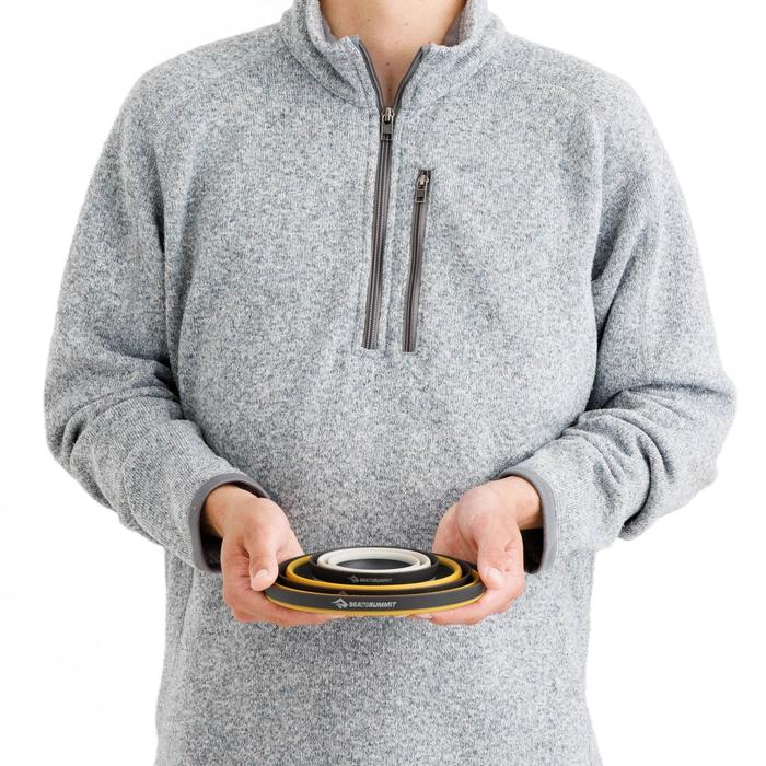 Diseñados para encajar, el tazón grande, el tazón mediano y la taza se pliegan para ocupar muy poco espacio en tu mochila. Además, su nueva construcción ligera significa que no añadirán mucho peso. A pesar de haber reducido su peso, su funcionalidad se ha mejorado. Cada tazón ahora tiene un borde para sujetarlo con seguridad y una curva entre la base y los laterales, a juego con las cucharas Sea to Summit. La taza tiene un anillo central además del borde superior para facilitar su agarre. Y, al ser pioneros en vajilla plegable para camping, puedes confiar en materiales de primera calidad, de grado alimenticio europeo.