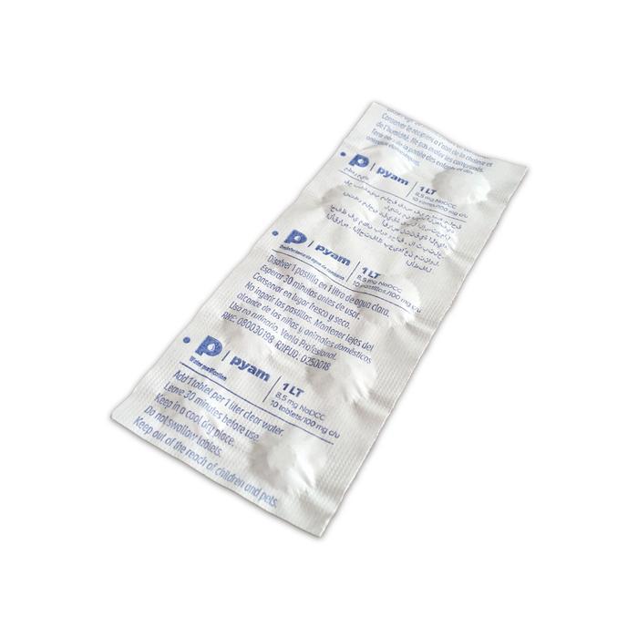 2 Blíster con 10 unidades de pastillas potabilizadoras cada uno. Cada pastilla rinde para 1 litro de agua