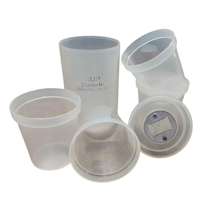 JUEGO DE 4 VASOS PLASTICOS + 1 CON TAPA Y ABRELATA
