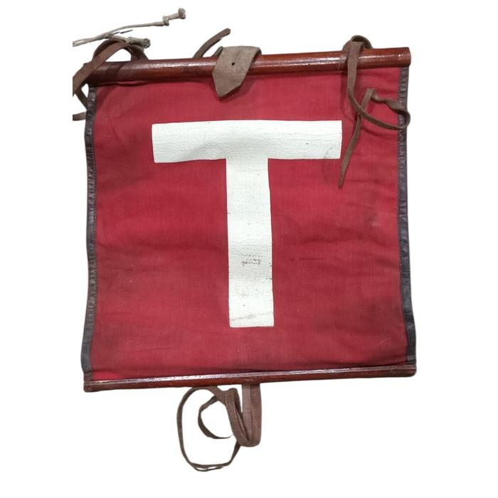 - Descripción: Bandera roja de tela con una letra "T" blanca en el centro, montada sobre rodillos de madera.