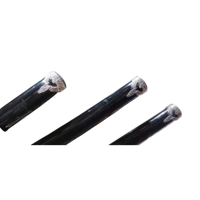 - Saya (vaina) de madera lacada en negro. Tsuka (empuñadura) con trenzado negro y Tsuba (guardamanos) de fundición con acabado plateado.