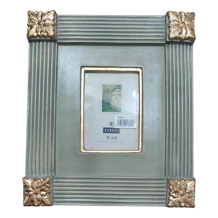 -MARCO EN CERAMICA PINTADO EN VERDE CLARO Y LAS ESQUIMAS CON DETALLE EN FLORES DORADAS CON PATINA ROJA