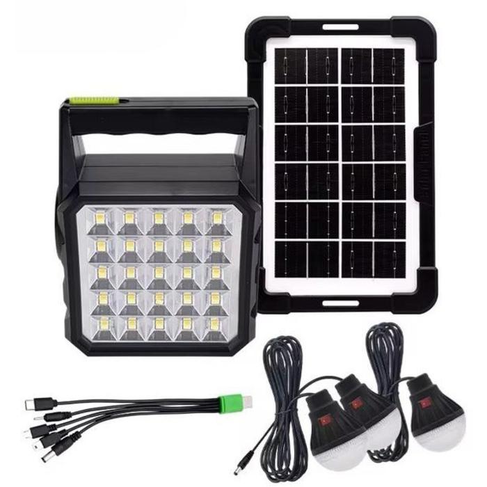 KIT PANEL SOLAR RECARGABLE PORTÁTIL CON 3 FOCOS y CABLE MULTIUSOS