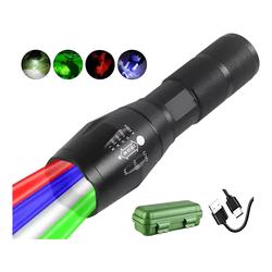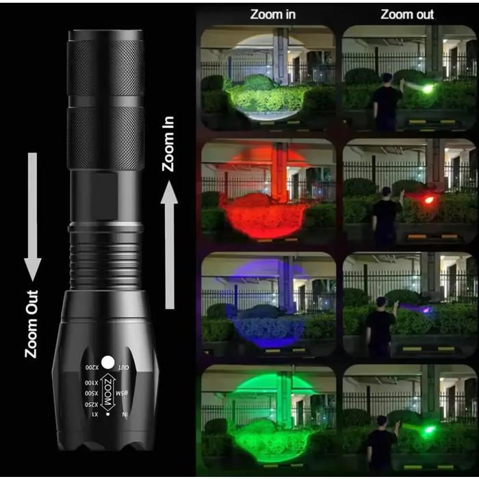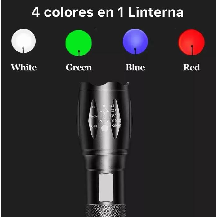 LINTERNA TACTICA CON ZOOM Y 4 LUCES: BLANCA, ROJA, AZUL Y VERDE