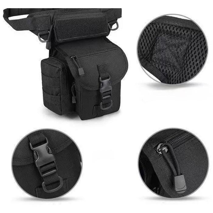 Hecha de nailon de grado militar 1000D, es resistente a los arañazos, al agua, al desgarro, etc. Gran capacidad: 3 compartimentos principales, 2 bolsillos laterales y 4 bolsillos ocultos, suficiente para acomodar equipo EDC, como teléfonos inteligentes, bancos de energía, billeteras, gafas de sol, cámaras digitales, linternas tácticas, llaves, suministros de primeros auxilios de emergencia, etc. Se puede utilizar como bolsa de pierna y bolsa de mensajero, perfecta para actividades al aire libre, camping, senderismo, caza, montañismo, motociclismo, ciclismo, militar, ejército, tiro con airsoft y paintball, viajes, vacaciones, viajes cortos, etc. El sistema de expansión externa está diseñado para usarse junto con otros equipos y kits de accesorios. Su cinturón ajustable y correas para las piernas se adaptan a casi todos.