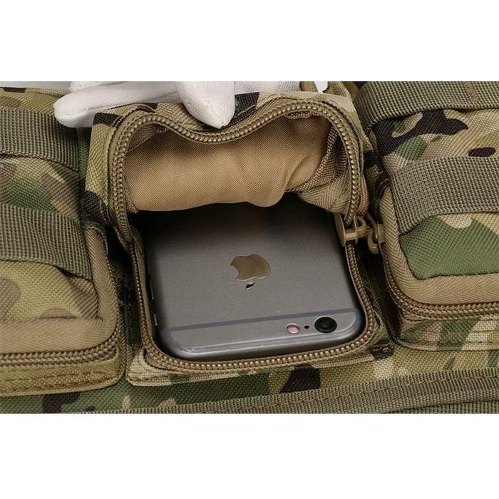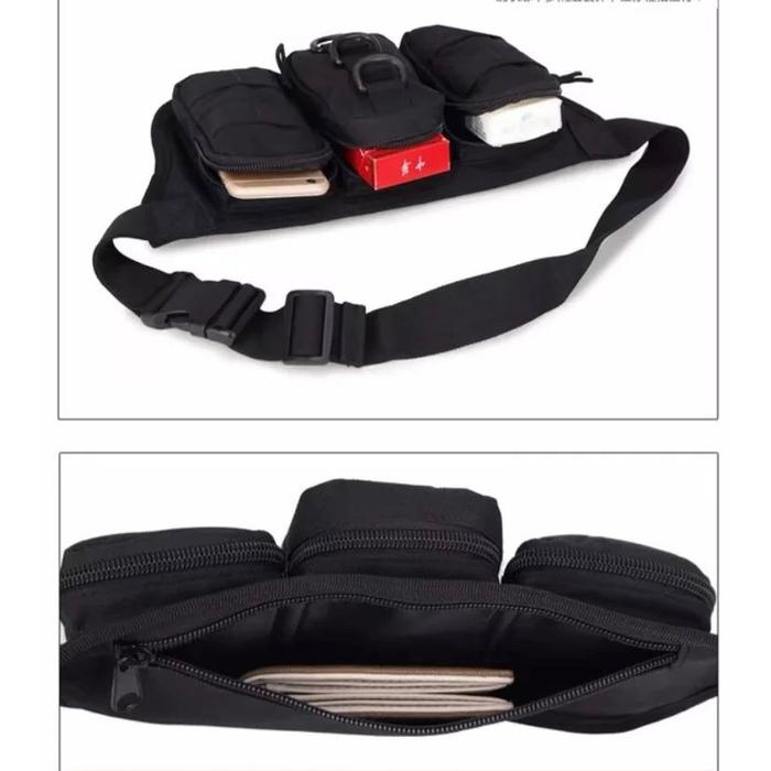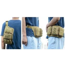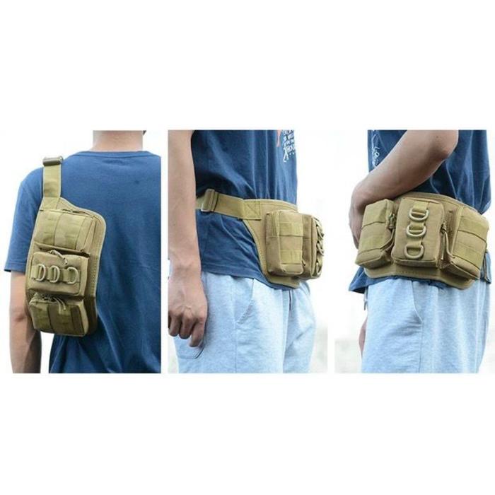 Hecho de tela Oxford 800D resistente al agua. Este material resistente protege sus objetos de golpes, sacudidas, caídas, golpes, salpicaduras, etc. Se puede utilizar como riñonera o bandolera. Posee un bolsillo oculto con buena capacidad de almacenamiento y tres bolsillos exteriores con sistema MOLLE para sujetar otros elementos. Ideal para acompañar las actividades al aire libre Especificaciones: Material: naylon 800D. Tamaño del bolsillo principal (largo x alto x profundidad): aprox. 28x16x5 CM Tamaño de los bolsillos exteriores (largo x alto x profundidad): aprox. 12x7,5x1,5 CM