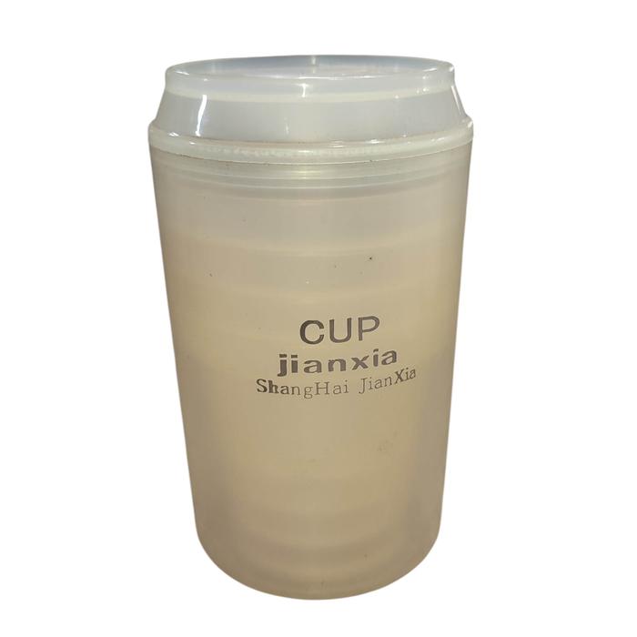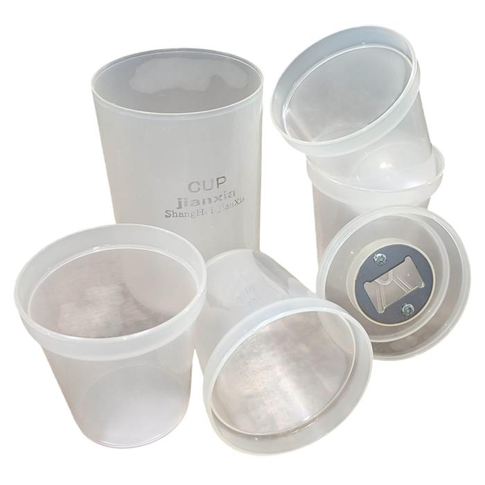 JUEGO DE 4 VASOS PLASTICOS + 1 CON TAPA Y ABRELATA