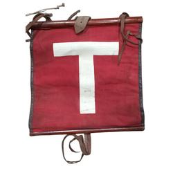 - Descripción: Bandera roja de tela con una letra "T" blanca en el centro, montada sobre rodillos de madera.
